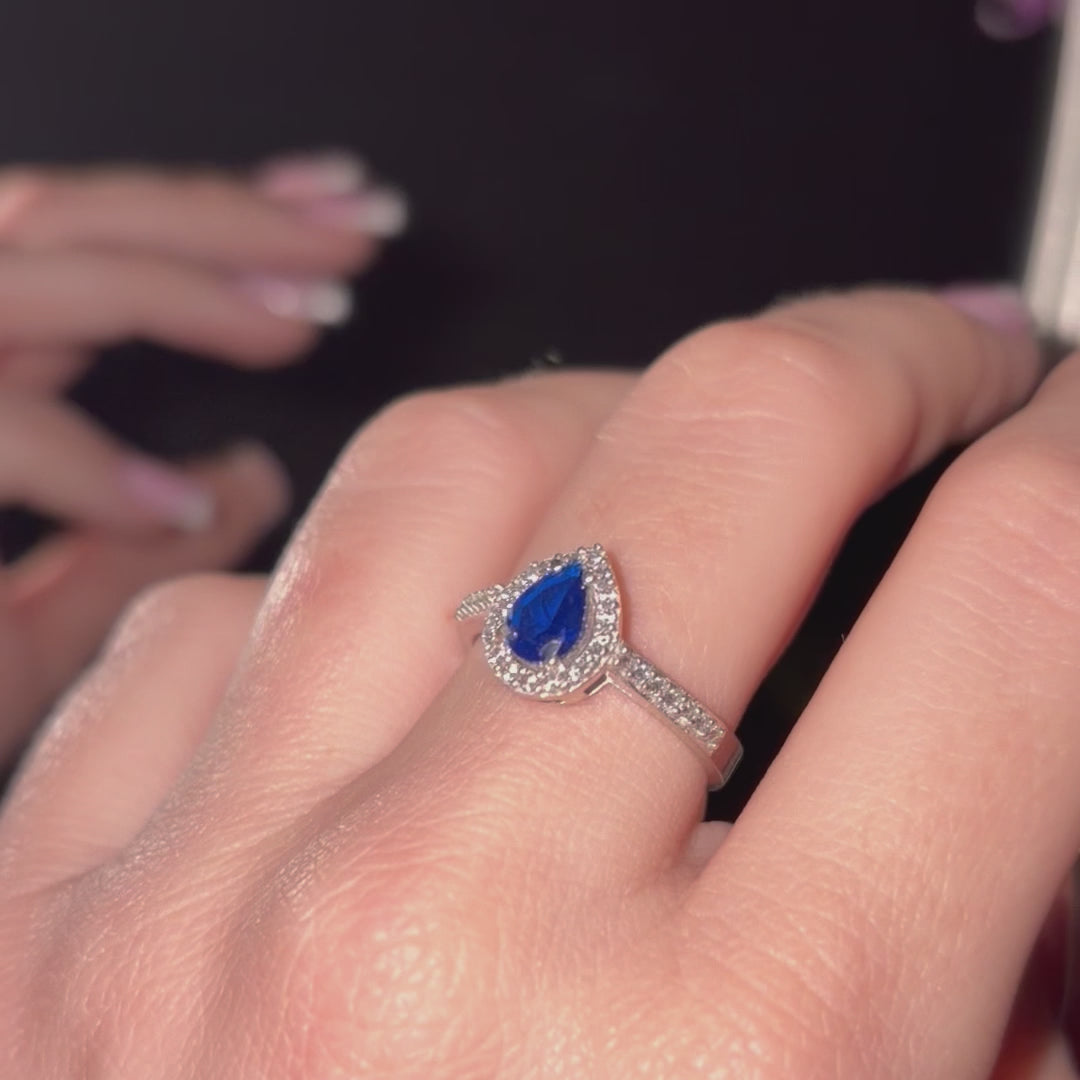 Classic elegance with a modern twist. The deep sapphire-blue teardrop stone catches the light beautifully, while the halo of zircons adds a glamorous finish. A must-have piece for timeless sophistication.