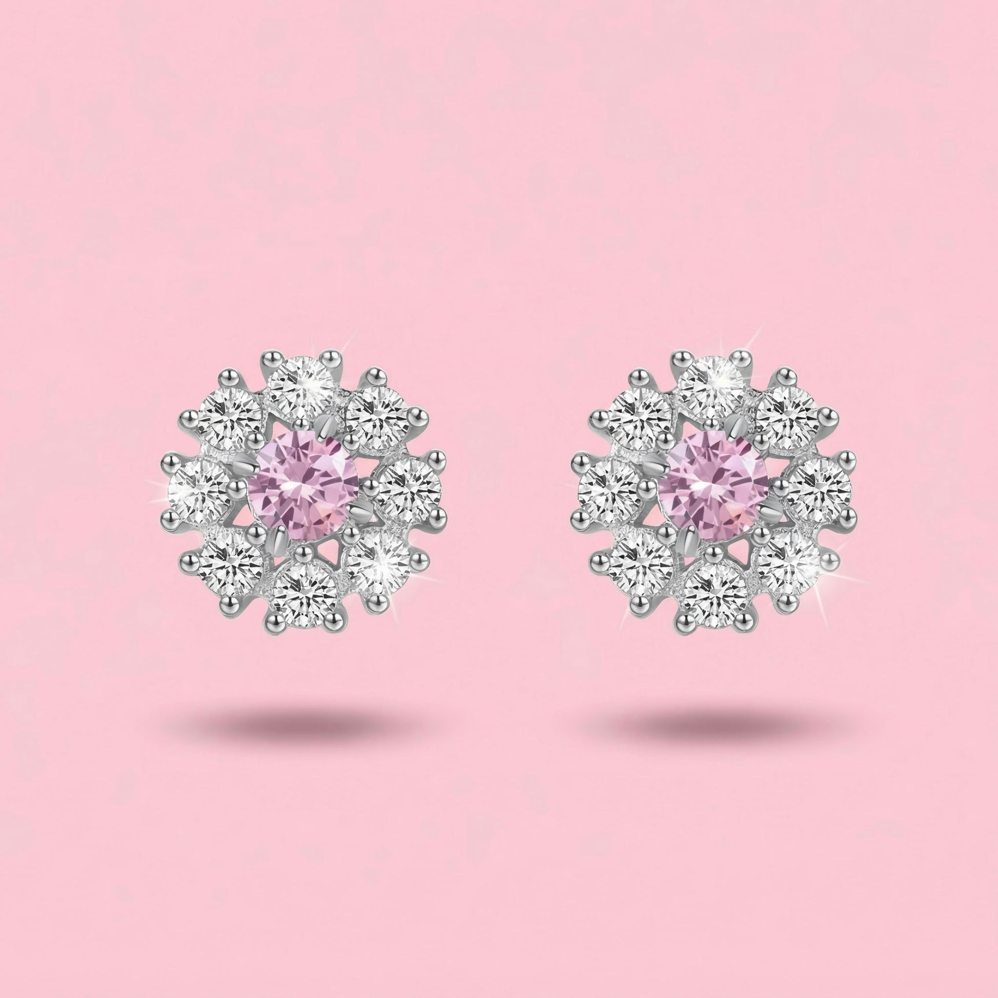 Delicate and radiant, our Sterling Silver Pink Flower Stud Earrings are the perfect blend of charm and elegance. Featuring a soft pink center stone surrounded by a halo of brilliant clear cubic zirconia, these earrings are designed to resemble a blooming flower in full sparkle.