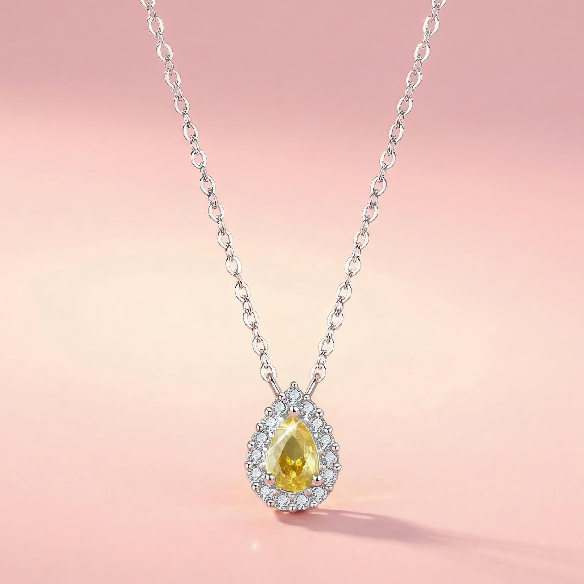 Shine with radiant elegance wearing our Sterling Silver Teardrop Yellow Gemstone Necklace. Featuring a vibrant yellow teardrop-cut stone surrounded by a halo of sparkling cubic zirconia, this necklace is a symbol of joy, energy, and positivity.